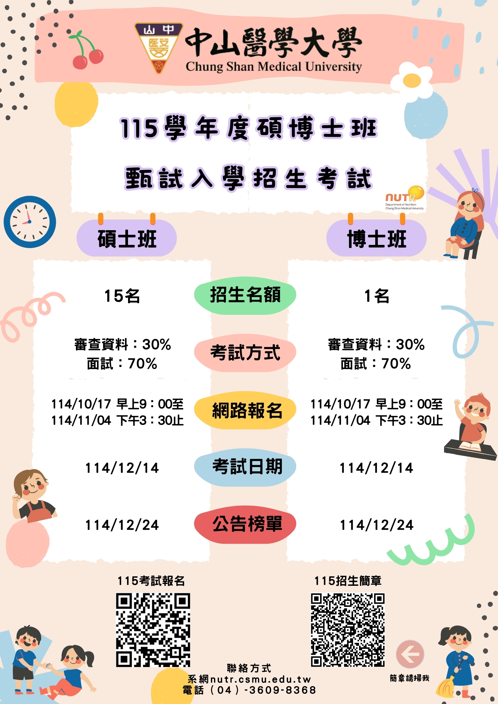 【招生公告】115學年度碩博士班甄試入學招生考試簡章公告