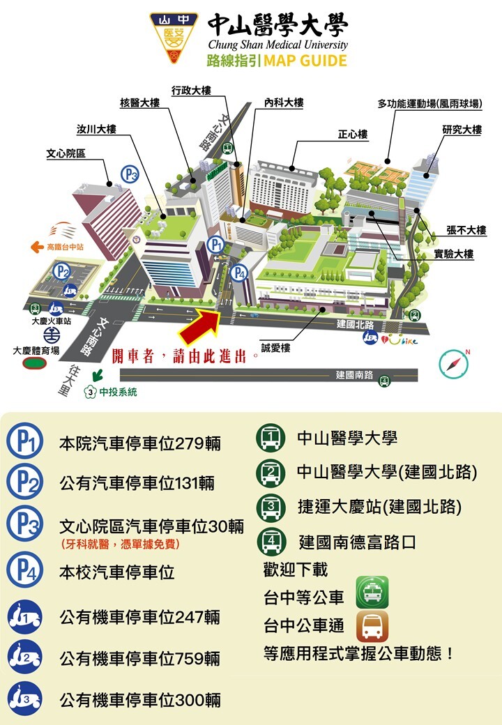 - 3. 搭乘全航客運公車158號、四方公司242號於中山醫學大學(建國北路)站下車。